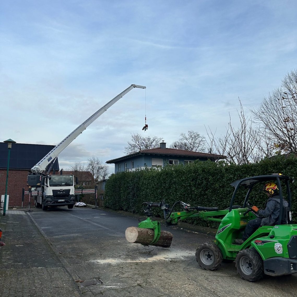 Bei großen oder schwierigen Bäumen setzen wir einen Kran ein. So können einzelne Baumteile kontrolliert angehoben und sicher abgetragen werden – besonders schonend für Umgebung, Gebäude und Garten.